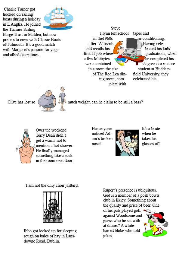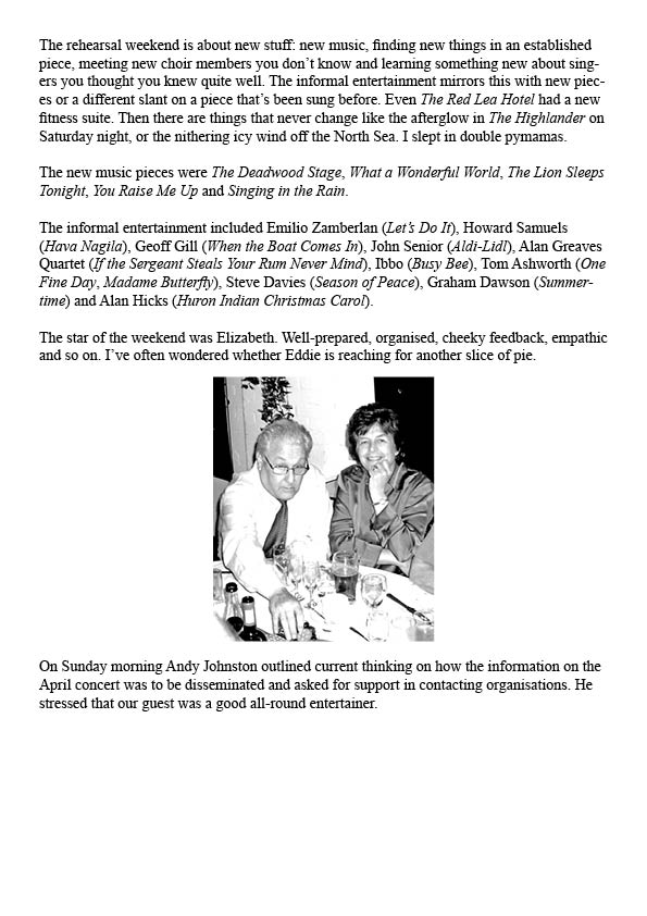 A successful and enjoyable weekend. We spoke to quite a few singers and wives we didn’t know well. Some with a London background which helped. After my ‘hypo’ Steph Horne talked about her diabetes – she is brilliant. I shared some of the older male preoccupations with baritone Ibbo and tenor Chris after a few pints of Landlord. Can’t remember what they were. And time away from our busy lives in the north.