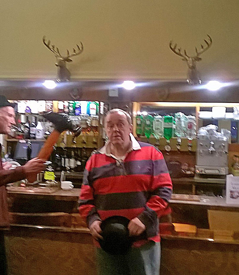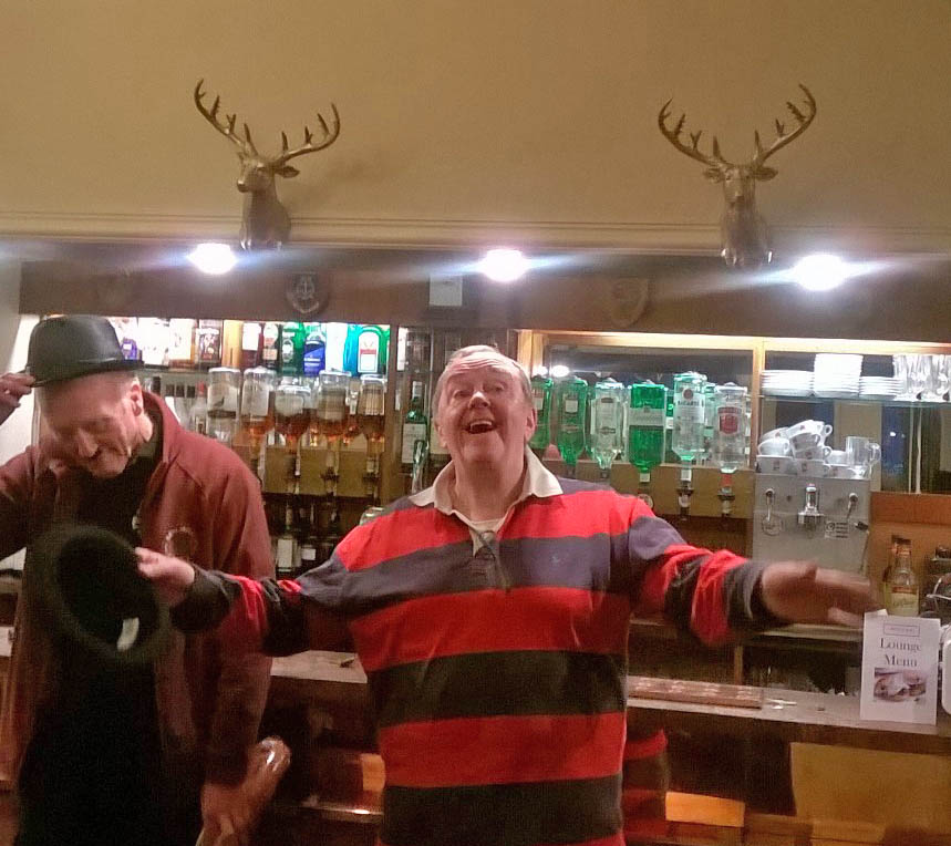 Dave Talboys is practising beer drinking, watched by Chris. Both are from Thurstonland Community Choir. Clive\’s attention has wandered.