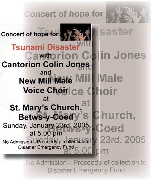 At the end of our Llandudno rehearsal weekend, 23rd January 2005, we joined Cantorion Colin Jones in Betws-y-Coed, N Wales, for a charity concert. £1400 were raised for the disaster relief fund. 27th February, we took part in Huddersfield in Harmony, again in aid of the victims of the tsunami. This concert, at Huddersfield Town Hall, was the brainchild of Graham Dawson, who brought together Honley and Gledholt MVCs, Honley and Marsh Ladies, Vocal Expressions, Sellers International and Hade Edge bands, compered by Harry Gration, raising, with an Examiner raffle, £20,000.